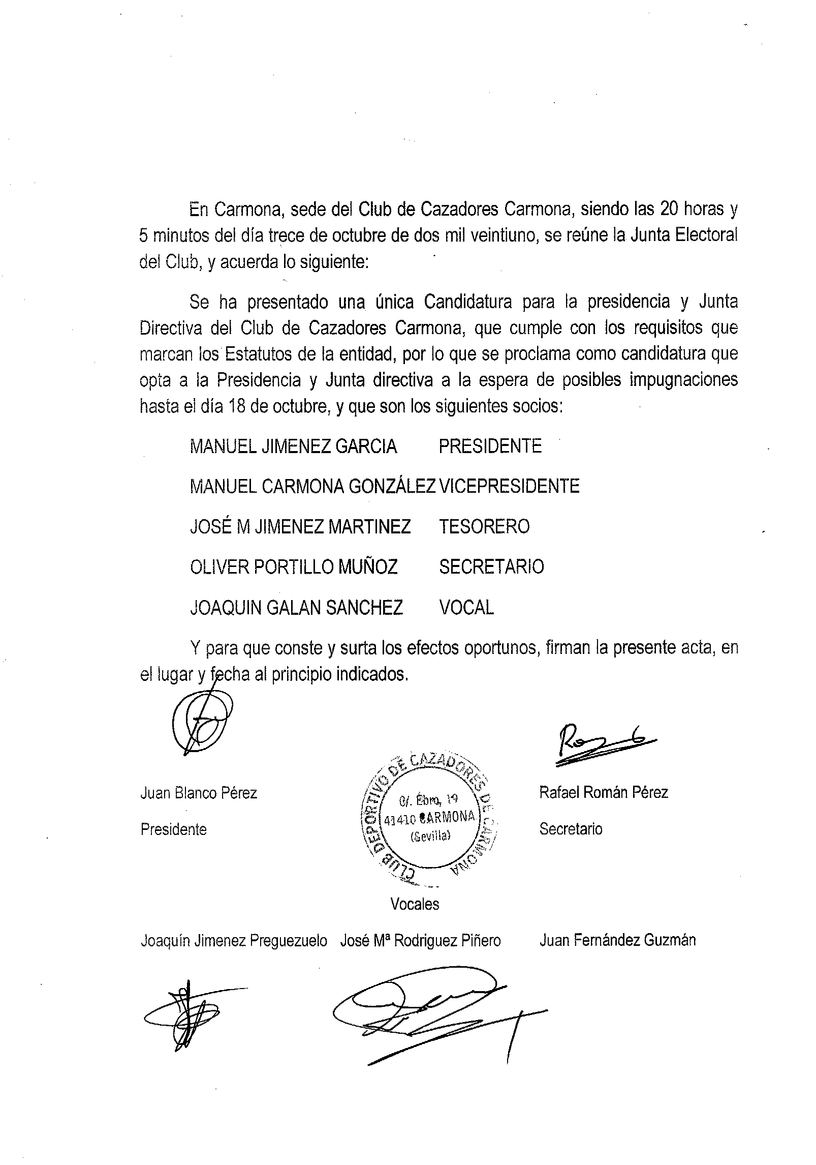 PROCLAMAR para los cuatro próximos años, a los siguientes socios como nueva JUNTA DIRECTIVA DEL CLUB CAZADORES CARMONA: